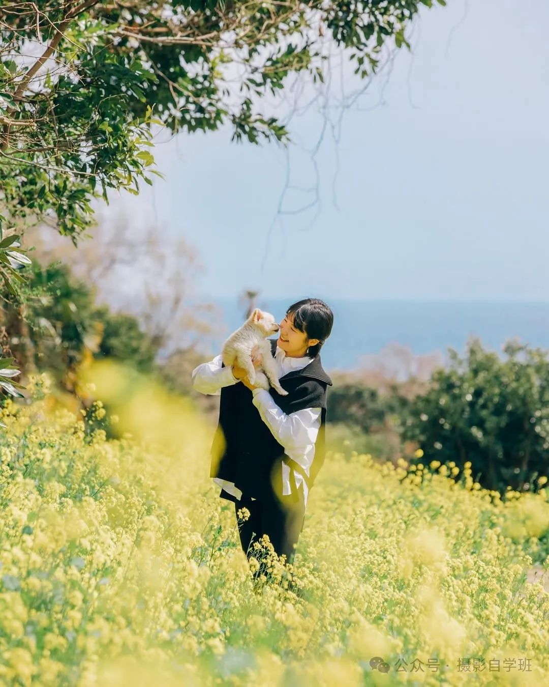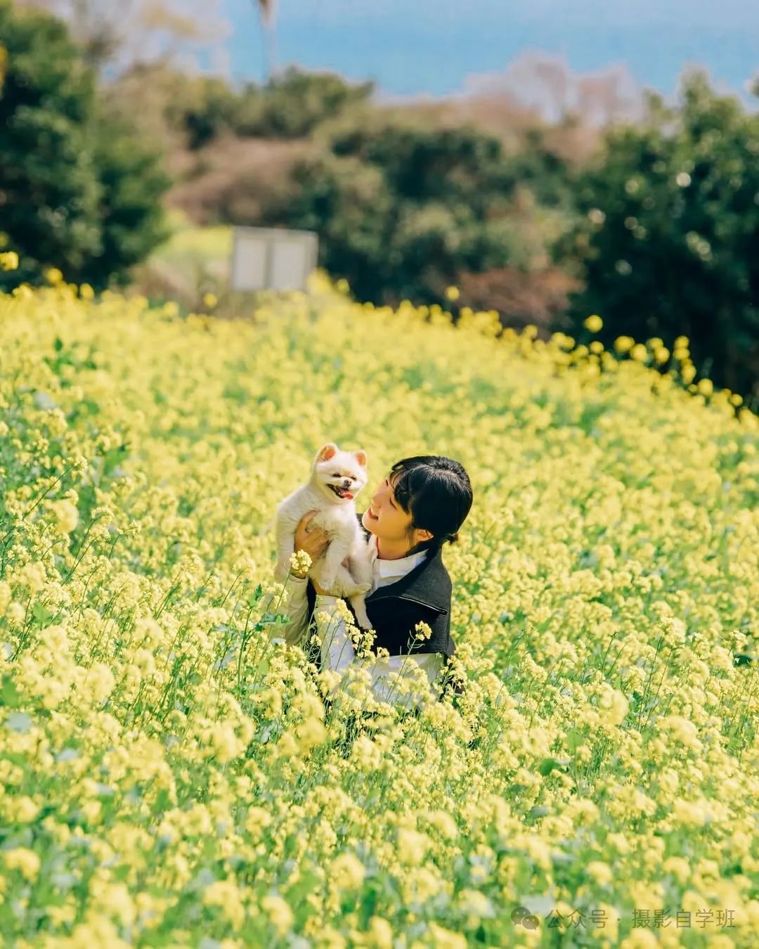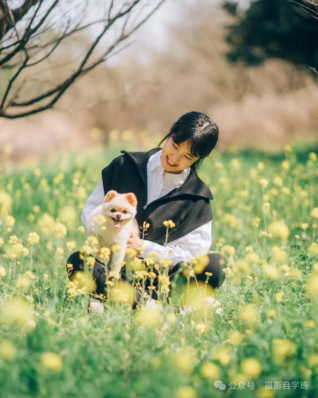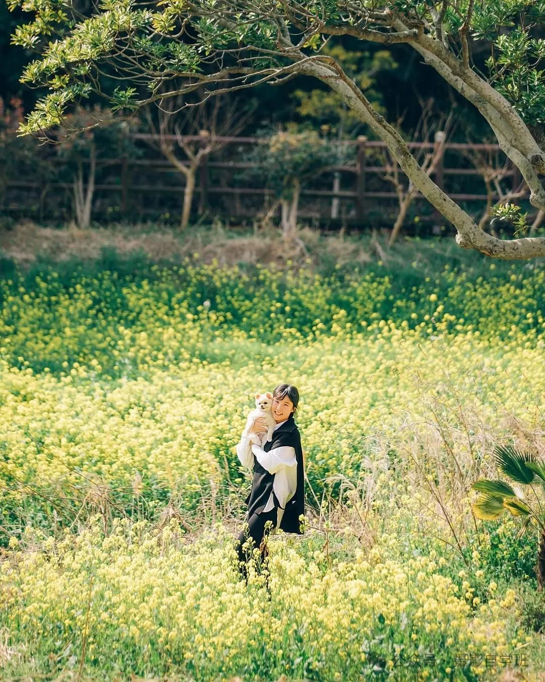 摄影师趴在花丛中,用油菜花做前景虚化。拿狗狗零食举在镜头正上方,等小狗瞪圆眼睛的瞬间连按快门。这个角度能让地面的花,形成点点虚化,被拍的人与小狗互动,更佳自然有爱。