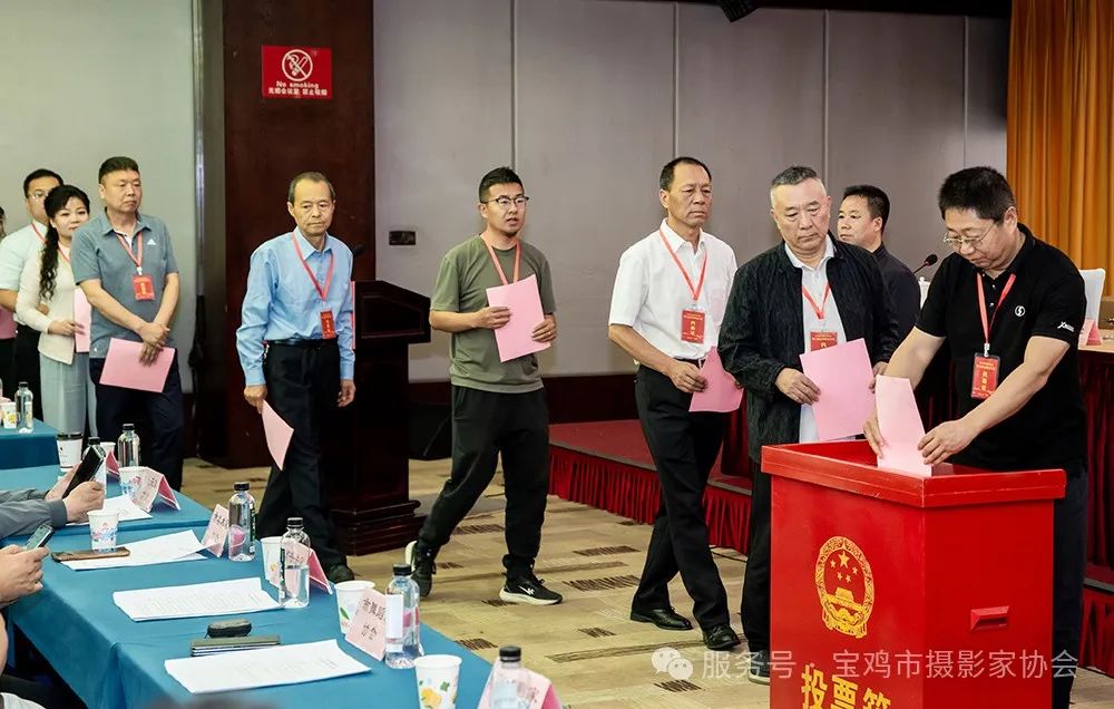 大会审议通过了宝鸡市摄影家协会第五届理事会《工作报告》、《财务工作报告》,表决通过了《宝鸡市摄影家协会章程》修改草案,选举产生了第六届领导机构。程建红当选市摄影家协会第六届主席,龙剑辉、陈玉庆、刘文东、姚东、马刚、徐小红、李青燕、童军当选副主席,徐小红当选秘书长。纪文林当选监事长,程友祥、张波当选监事。聘任冯晓伟为名誉主席,李胜利、赵华、王尚勋、孙越峰、梁世来、赵录贤同志为宝鸡市摄影家协会顾问。
